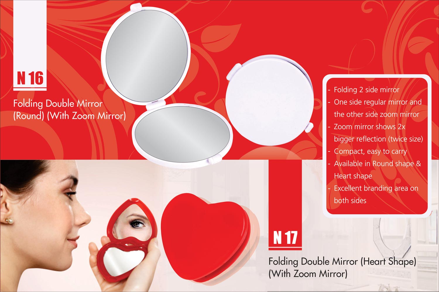 A compact and stylish folding mirror with two sides—one regular mirror and one 2x zoom mirror for detailed viewing. Available in both heart and round shapes, with a large branding area on both sides.